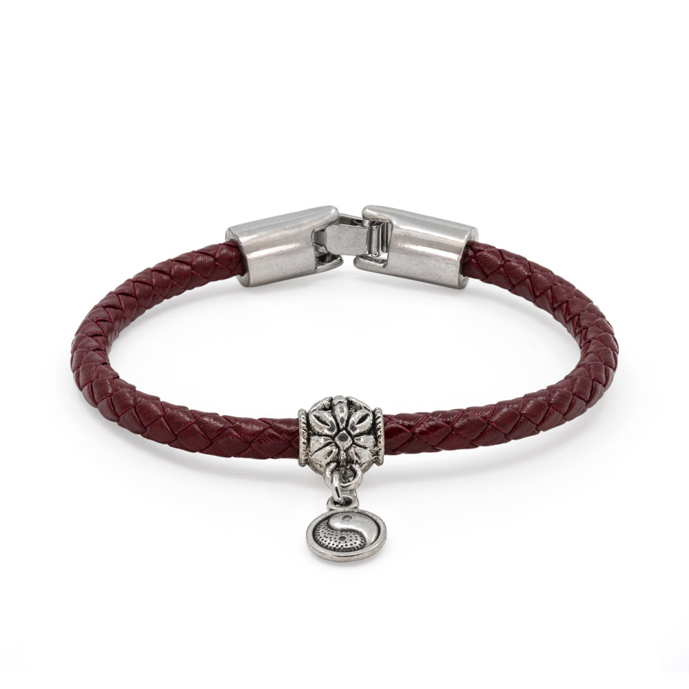 Șnur împletit din piele, charm argintiu Yin Yang, încheietoare din oțel inoxidabil.