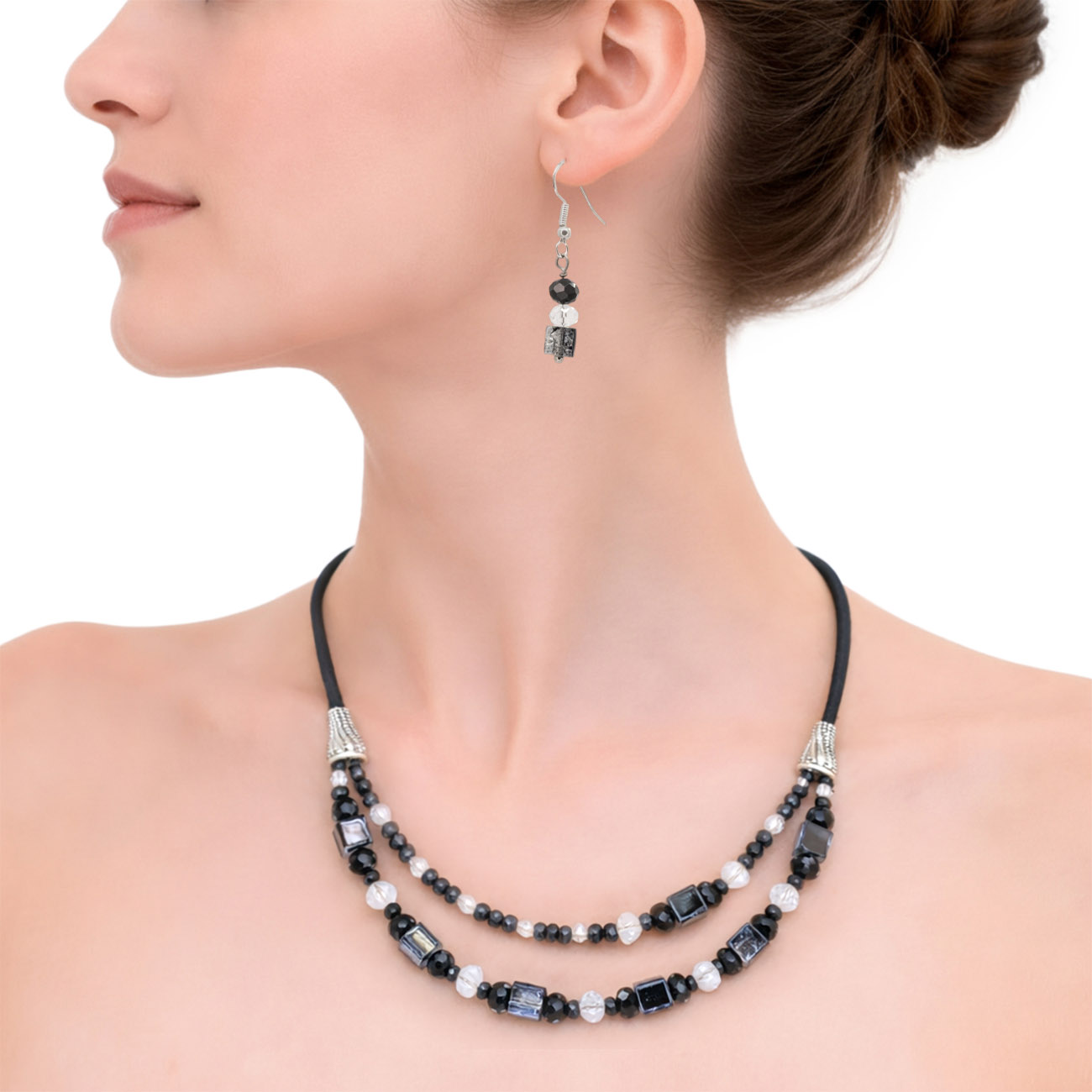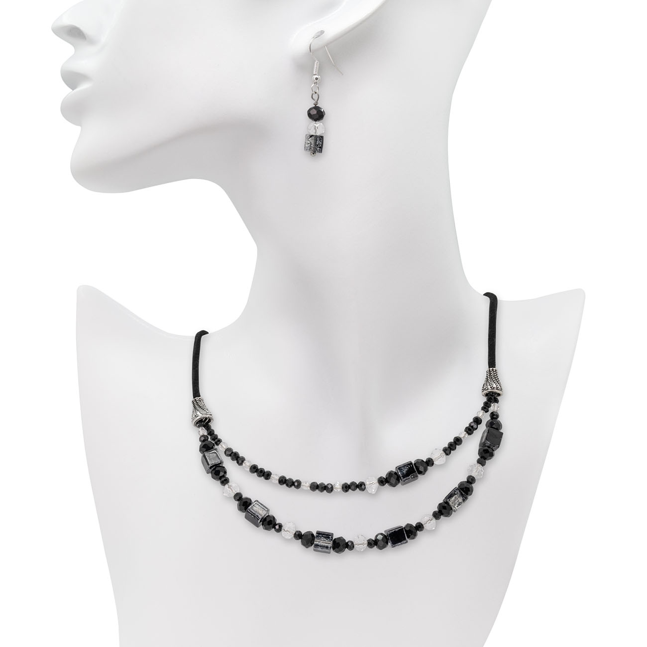 Tortițe de cercei cu arc și bilă din alamă, placate cu argint, testate dermatologic. Colier cu cristale fațetate, cristale cubice sticlă Crackle, șnur Suede, închizătoare lobster din oțel inoxidabil.