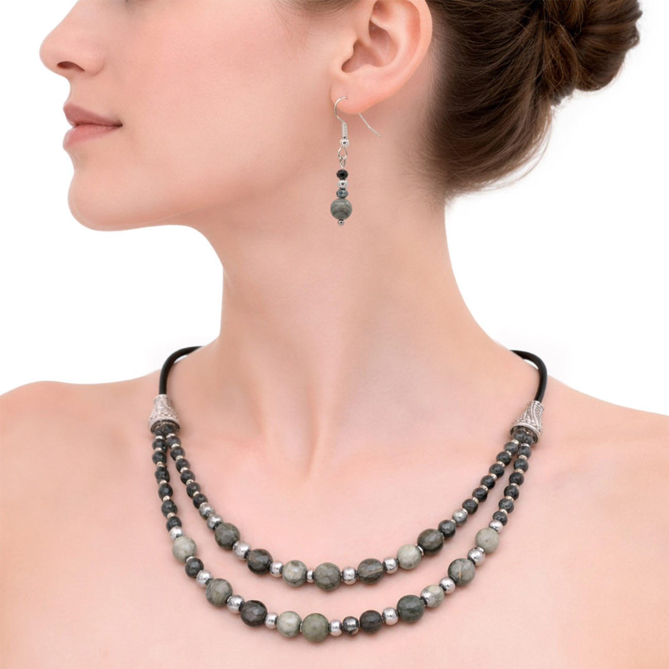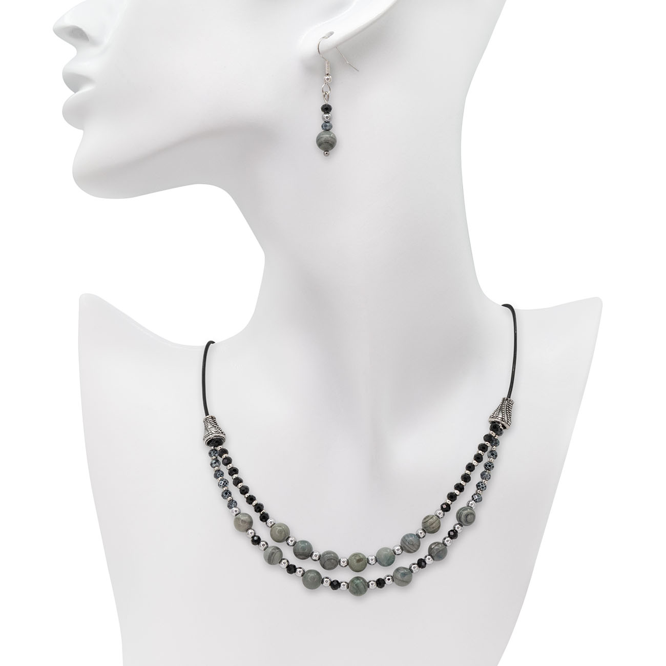 Tortițe de cercei cu arc și bilă din alamă, placate cu argint, testate dermatologic. Colier cu mărgele Jasp Silver Line, mărgele Hematit electroplacate argintiu, cristale fațetate, șnur din piele, închizătoare lobster din oțel inoxidabil, lanț prelungitor din oțel inoxidabil (5 cm) cu charm trifoi.