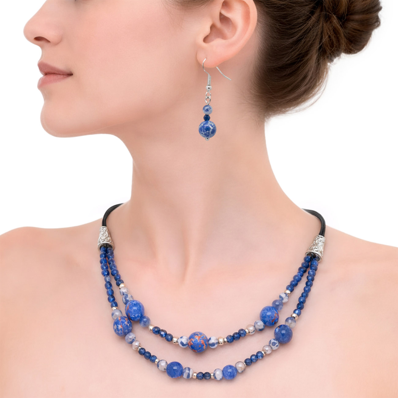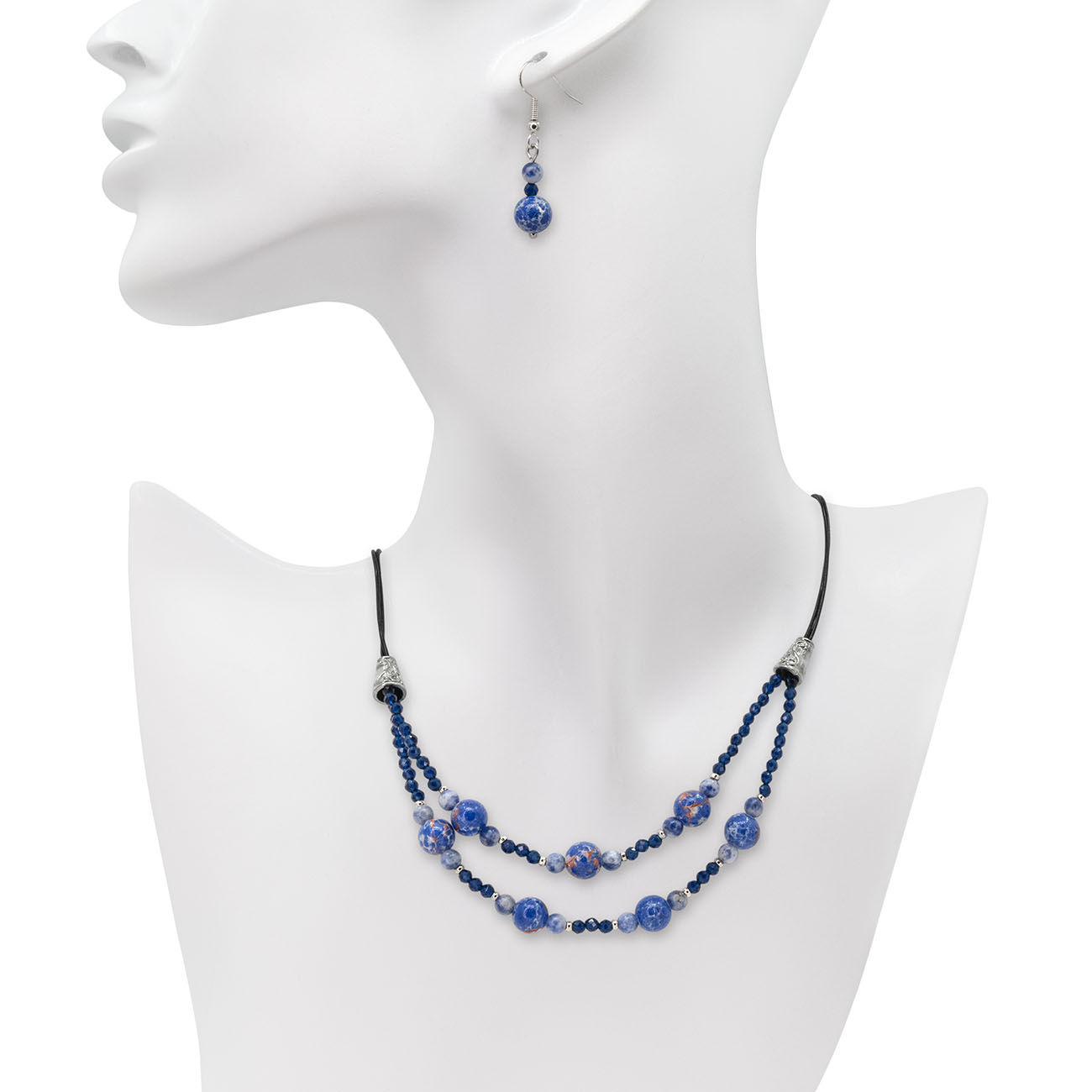 Tortițe de cercei cu arc și bilă din alamă, placate cu argint, testate dermatologic. Colier cu mărgele Jasper Imperial, mărgele Sodalit, cristale fațetate, accesorii argintii, șnur din piele, închizătoare lobster din oțel inoxidabil, anț prelungitor din oțel inoxidabil (5 cm).