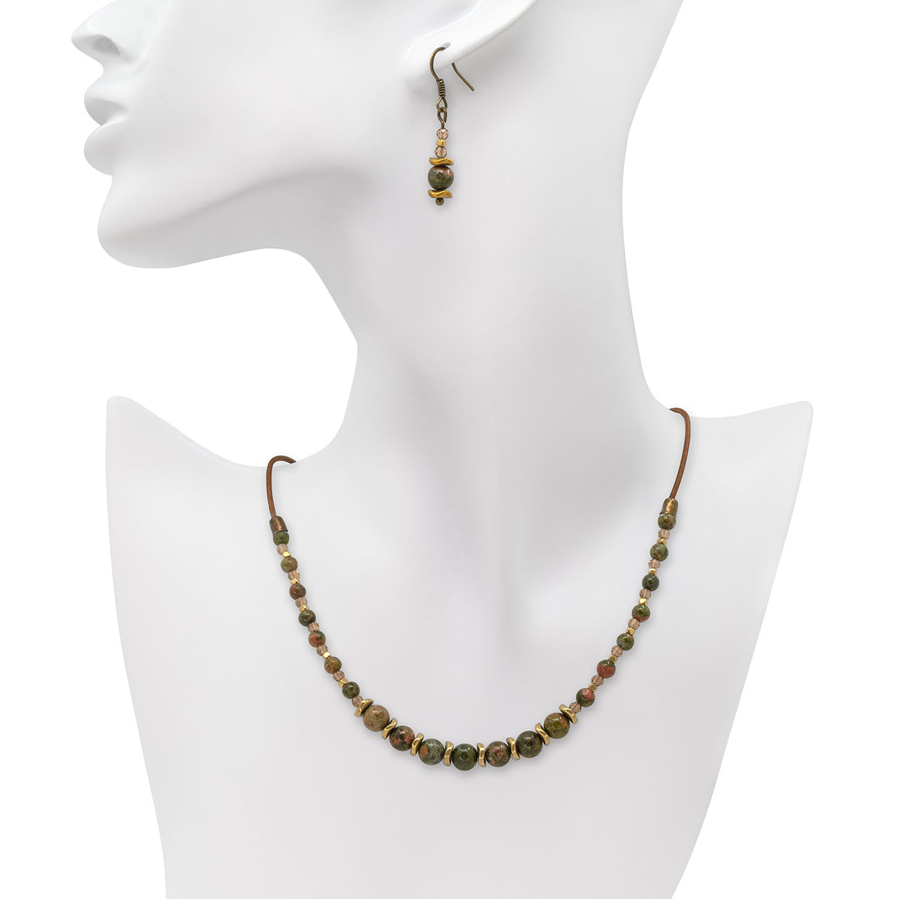 Cercei cu tortițe din alamă, patinate, testate dermatologic. Colier cu mărgele Unakite, rondele ondulate electroplacate și cuburi rotunjite din hematit, cristale fațetate, șnur din piele, închizătoare din bronz, anț prelungitor din bronz (6 cm) cu charm lacrimă.